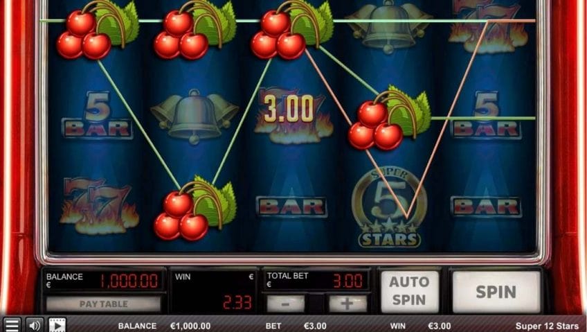 In Super 12 Stars, your path to glittering wins starts with three or more matching symbols on one of 30 fixed paylines. Symbols pay from left to right, and only the highest win per line shines through.